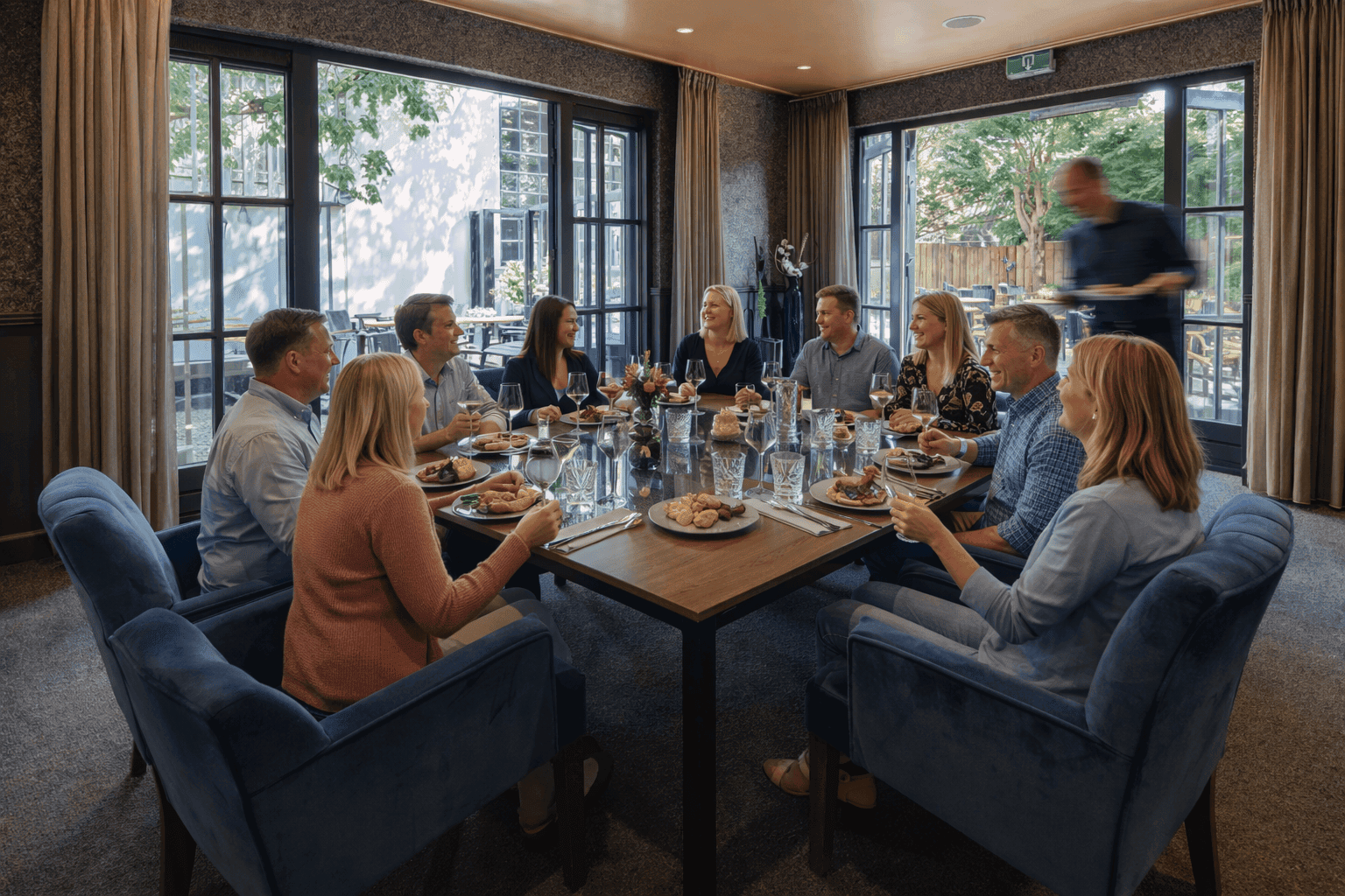 De Terraszaal ligt direct aan het rustieke Heerenterras en is daarmee een heerlijke plek voor een intieme private dining tot 16 personen. Door het vrije uitzicht op de tuin en het vele daglicht hangt hier een ontspannen sfeer—alsof je even helemaal weg bent, terwijl je toch midden in Montfoort zit.